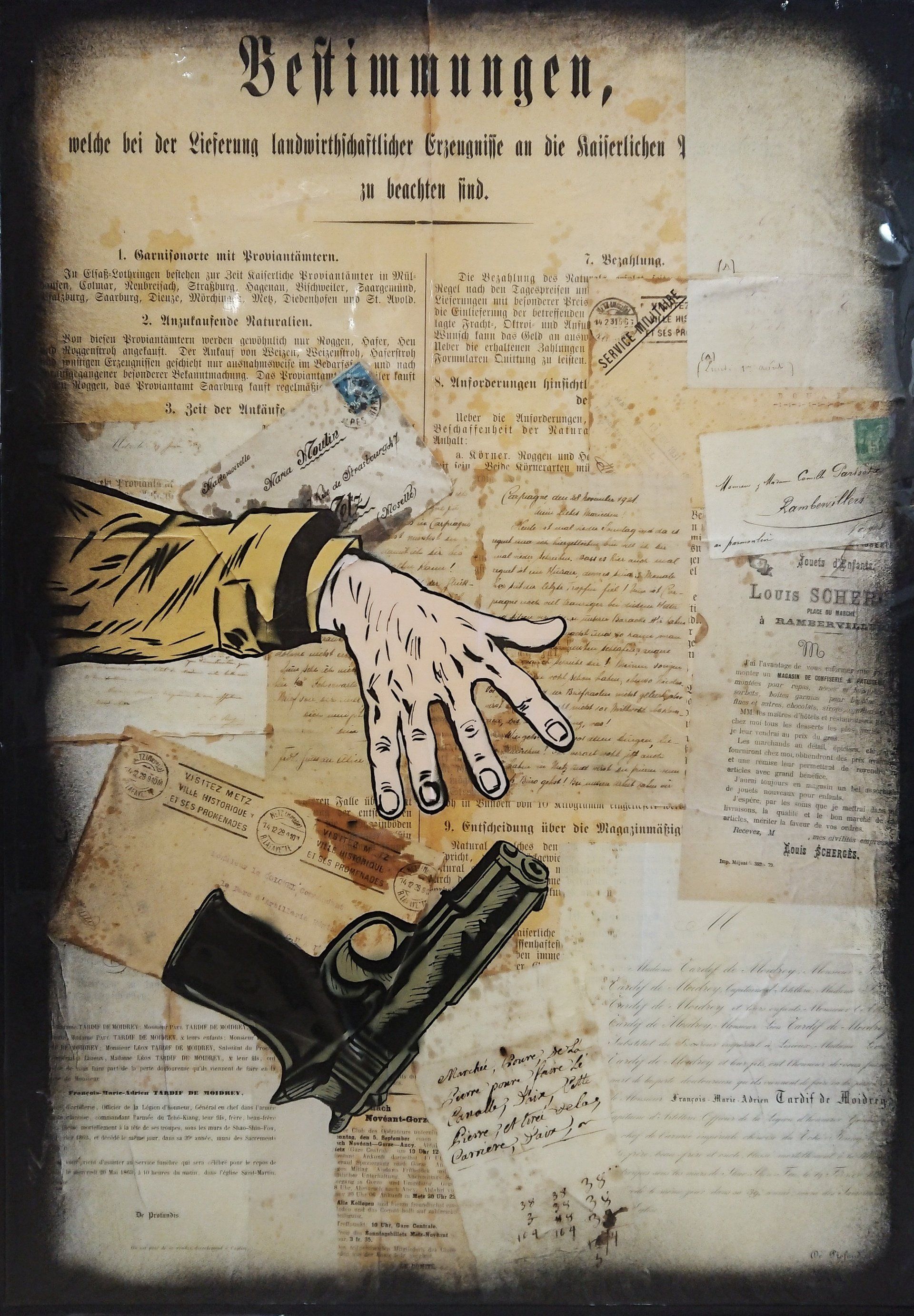 Erik Bonnet nutzt verschiedenstes Archivmaterial aus Ausgangspunkt seiner Arbeiten, indem er es modernisiert und „pop-isiert“: Leinwand, Papier, Platten, Audiokassetten, Konservenbüchsen und Spielzeug werden verändert und durch Collagen, Schablonen und Filz ins Zentrum gerückt. Die Konfrontation von altem, authentischem Material und modernen und populären Techniken gibt seinen Werken eine Tiefe und damit eine historische Dimension.